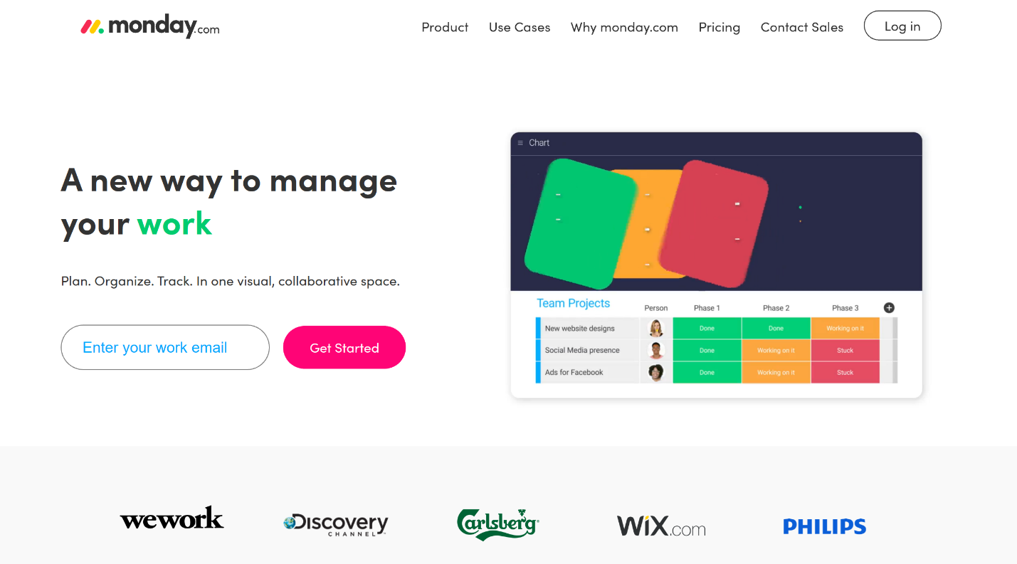Monday.com incorporates a concise headline, an above-the-fold CTA, clean design, simple navigation bar, and social proof.
