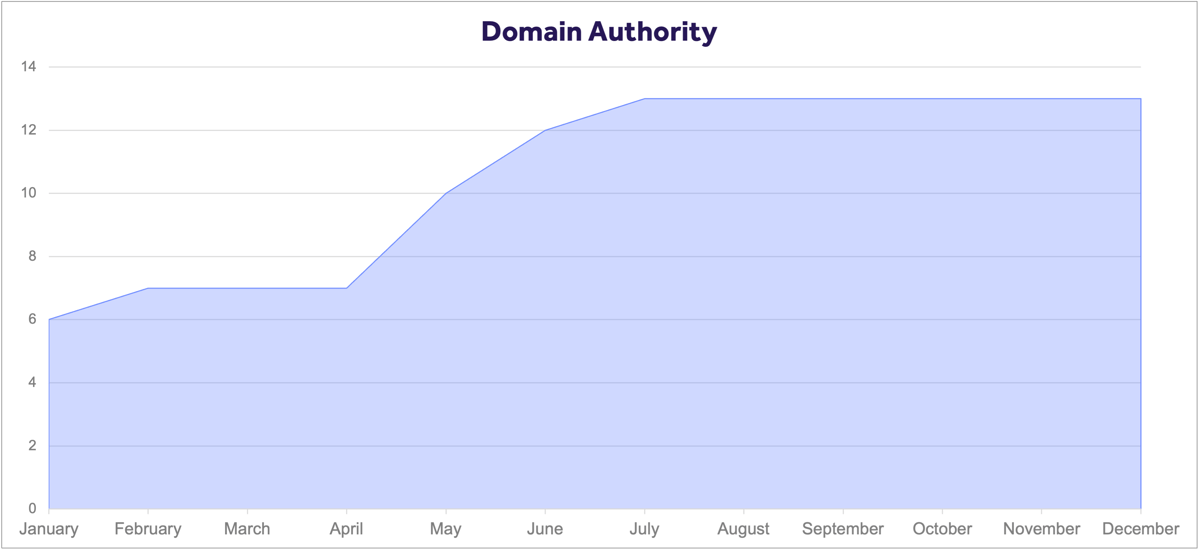%The credibility established through the two teams' hard work, combined with a 65% increase in referring domains from January through the end of the program in August and an almost 130% rise from January to December, also had a dramatic impact on the Elxo website’s domain authority score, which more than doubled from the beginning to end of 2024, increasing from 6 to 13. And in December, backlinks and referring domains continued to rise.