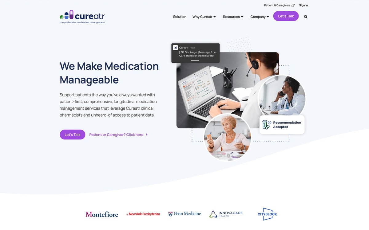 Cureatr was a medication management and optimization company that sold tech and tech-enabled services to at-risk health care enterprises.